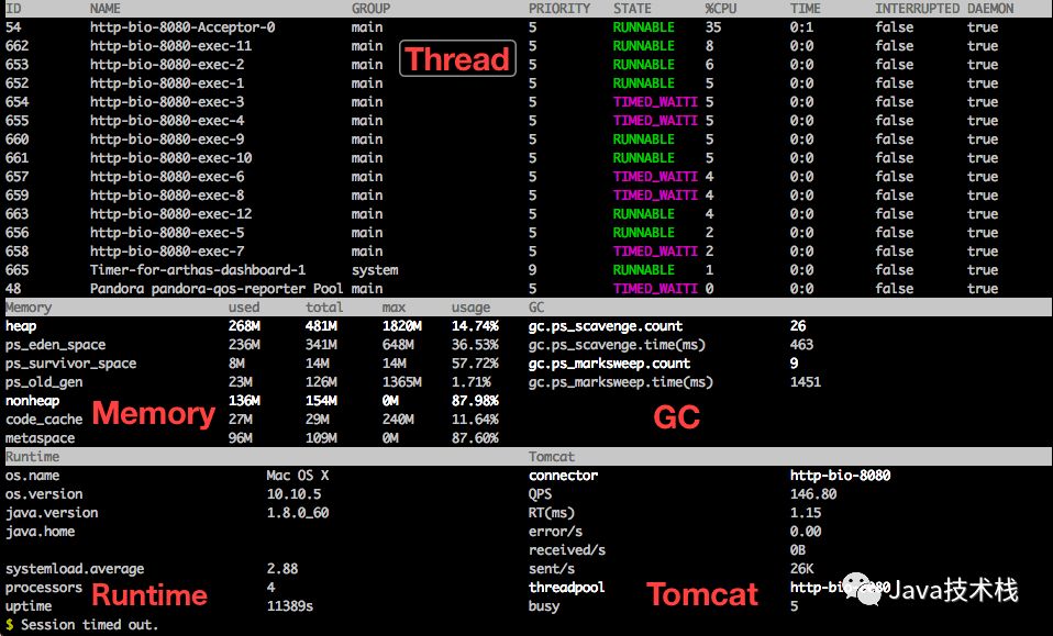 总结下来,使用 Arthas 可以很方便的诊断一个 Java 应用程序,如:系统数据面板、JVM实时运行状态、类加载情况、监控方法执行情况、显示方法执行路径等。