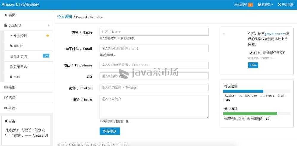 Amaze后台管理模板,简洁大气,全套模板,包括的后台登录页面、表单提交页、 数据表格页、相册、帮助页、个人资料、控制台、错误日志、404错误页等后台模板页面。